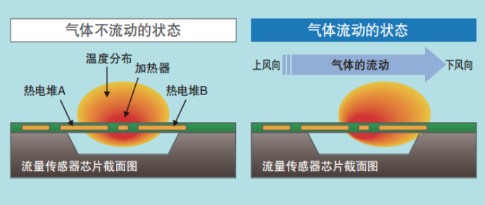 歐姆龍MEMS流量傳感器檢測原理在沒有氣體流動的情況下以加熱器為中心,溫度分布左右對稱。流動的狀態下,加熱器上風向的溫度低,下風向溫度高,溫度分布不再對稱。將該溫差作為熱電堆的電動勢之差進行傳感,可測量流量、流速而不影響溫度、壓力。此外,熱電堆為熱電動勢方式,與電阻式相比,有助于降低功耗。