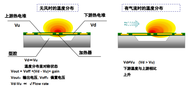 通過給MEMS芯片加恒定電流,使芯片中央的加熱器產生熱量。沒有風通過時,加熱器上游熱電堆和下游熱電堆由于熱平衡的關系,兩者對應的熱電動勢電壓相等,即Vu=Vd。當有氣體流動時,熱源隨氣流方向向下游轉移,此時下游熱電堆的電動勢變大,即Vd> Vu。兩個熱電堆的輸出差大致與通過傳感器表面的氣體質量流量的平方根成正比。輸出靈敏度和質量流量取決于氣體的組成比。微小的信號可以通過放大電路進行放大,再以電子方式檢測氣體流量。風量傳感器經調整后輸出的電壓與質量流量為 25°C、 101.3kPa 時的流速相當。