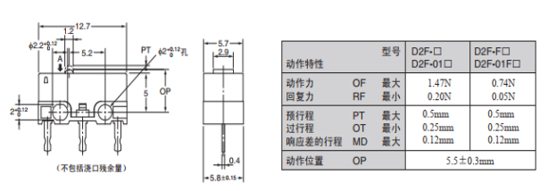 歐姆龍微動(dòng)開關(guān)D2F-F的優(yōu)勢:超小型,性能穩(wěn)定,動(dòng)作力只需要0.74N,能夠更精準(zhǔn)地感應(yīng)剎車片磨損的程度,為風(fēng)力發(fā)電機(jī)的安全運(yùn)作提供給更有力的保障,以下是D2F-F的尺寸圖和動(dòng)作特性。