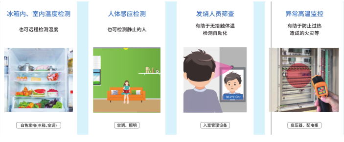 物體檢測:可以針對對象物進(jìn)行定點(diǎn)精確檢測,無需接觸即可測量對象物的溫度,適用于工業(yè)設(shè)備,非接觸溫度計,冰箱,微波爐,電磁烹飪爐,等領(lǐng)域。