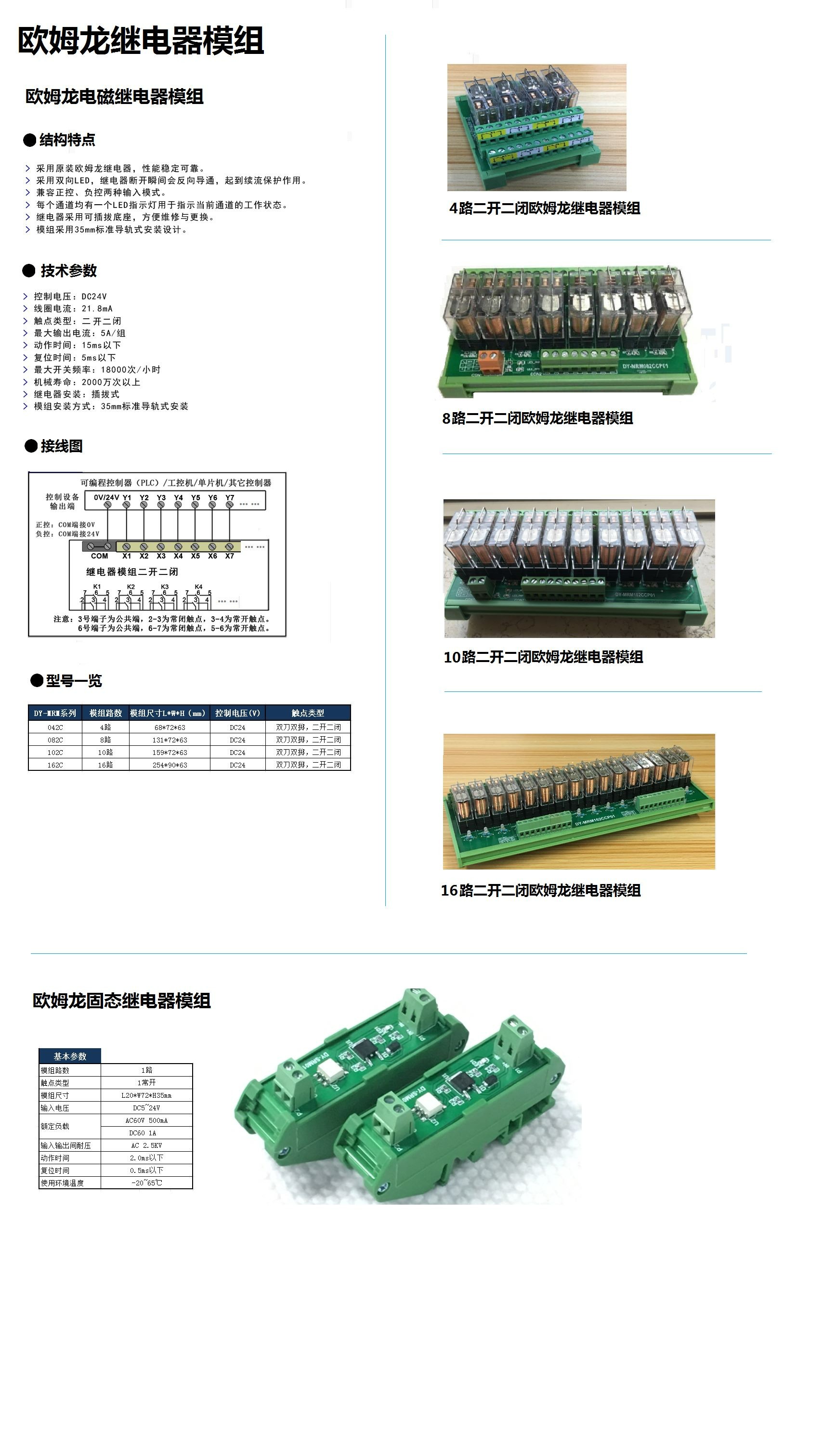 采用原裝歐姆龍繼電器,性能穩定可靠。32路,16路,8路均可定制,規格齊全 采用雙向LED,繼電器斷開瞬間會反向導通,起到續流保護作用。 兼容正控、負控兩種輸入模式。 每個通道均有一個LED指示燈用于指示當前通道的工作狀態。 繼電器采用可插拔底座,方便維修與更換。 模組采用35mm標準導軌式安裝設計。