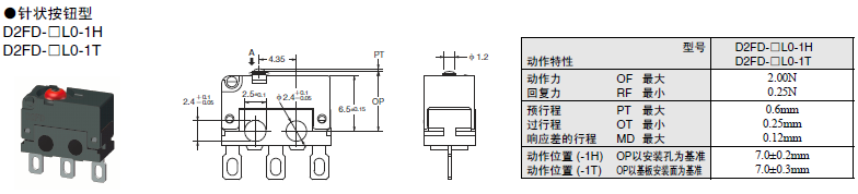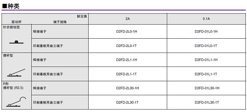 D2FD-2 超級小型基本開關(guān) 兼具防塵功能的極超小型基本開關(guān) 利用橡膠封裝的密封結(jié)構(gòu)實現(xiàn)防塵 (IEC IP6X)。可在有灰塵、紙粉的環(huán)境下使用。 可動片為1片彈簧構(gòu)造,支持AC125V 2A開關(guān),更有微小負(fù)載型可供選擇。 還備有焊接、印刷基板用端子。