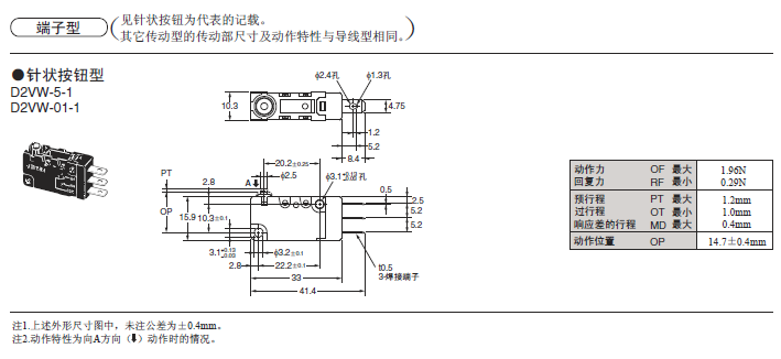 D2VW-5 密封型基本開關 密封型(符合IP67:除端子部 以外)的小型基本尺寸 采用環氧樹脂來確保穩定的密封性。可以在會淋水或多塵埃的地方使用。 內部結構采用廣受好評的V系列的結構,實現高精度和長壽命。安裝也和V系列相同。 可在汽車、農業機械、大型家電、辦公設備等有耐環境性要求的場合使用。