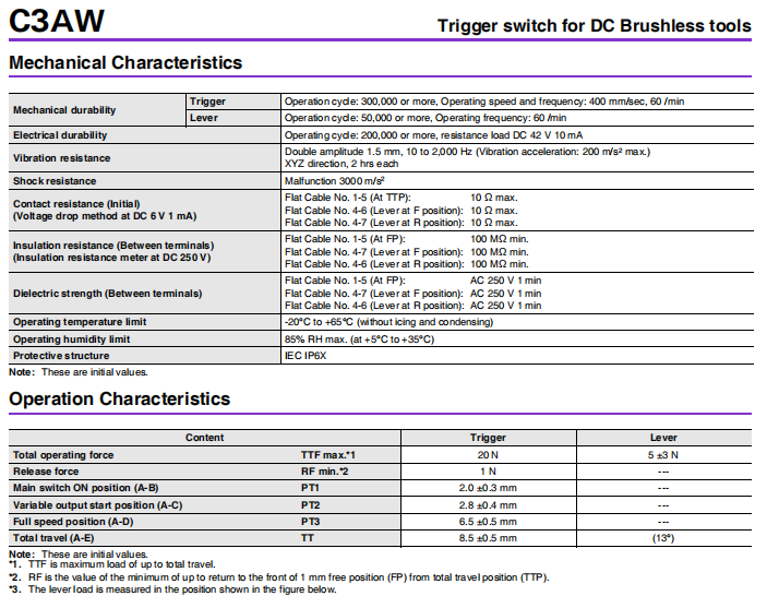 通過在蓋殼之間安裝密封罩和超聲波焊接連接來實現防塵 (IEC IP6X) 增強接觸抗沖擊性 觸發的持久性是 300,000 次或更多次操作 通過將扁平電纜 AWG #28 直接連接到開關來節省線路