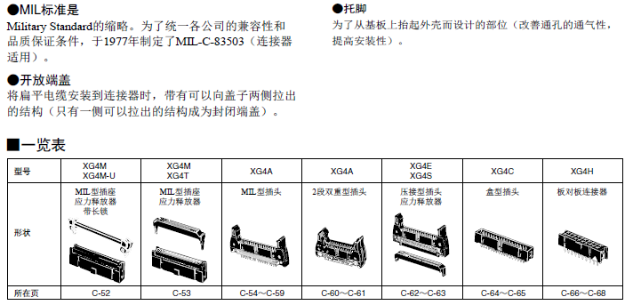 印刷基板連接器的核心、MIL規(guī)格標準品 通過采用新型生產(chǎn)力設計,高可靠性與低價格的同步實現(xiàn)。 備有便于省空間封裝的盒型插頭(XG4C)。 同時具有可進行中繼使用的壓接型插頭(XG4E)。 將本公司的散線壓接型連接器(XG5)特有插頭(XG8)與PCB型(XG2)組合使用可實現(xiàn)種類豐富的各種封裝。 適用本公司自己開發(fā)的簡易鎖定擺桿可以使特有插頭(XG8)和盒型插頭(XG4C)也能夠進行鎖定。 MIL規(guī)格(MIL-C-83503)標準。 標準品符合UL規(guī)格(File No. E103202)認證產(chǎn)品。