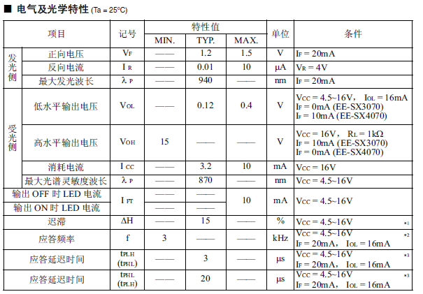 光電IC輸出型微型光電傳感器[透過型] 受光元件與增幅回路內置于一個芯片 受光元件中內置有溫度補償回路 適用電源電壓為DC4.5 ~ 16V 可直接連接C-MOS、TTL 高分辨率(狹片寬度 0.5mm) 遮光時ON型:EE-SX3070