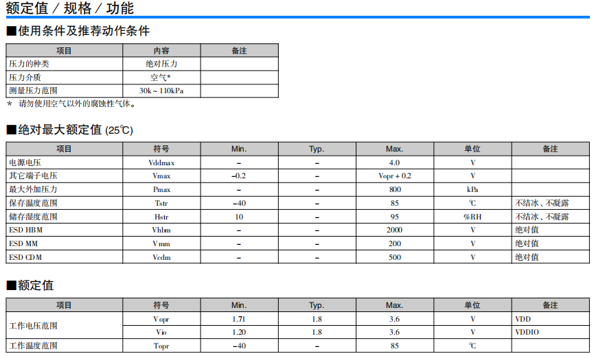 高精度·低消耗電流的小型MEMS絕對壓力傳感器 高精度地測量氣壓 內置低干擾的24bit ADC 基于I2C/SPI 接口的數(shù)字控制/輸出 在自動睡眠模式下實現(xiàn)低消耗電流 單獨的補償系數(shù)保存在OTP*中 (* One Time Programmable - ROM)